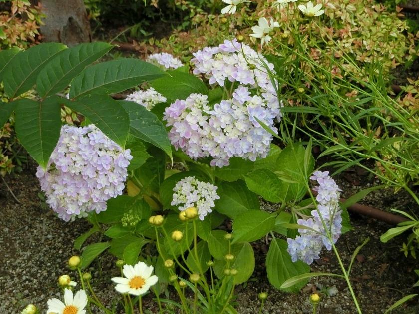 「レインボー・アジサイ」を撮影するには、昨年は無かった左側の樹木の枝&葉っぱ、右側に咲いている白色の「コレオプシス」が邪魔になりますが、勝手に切断するわけにはいきませんね。