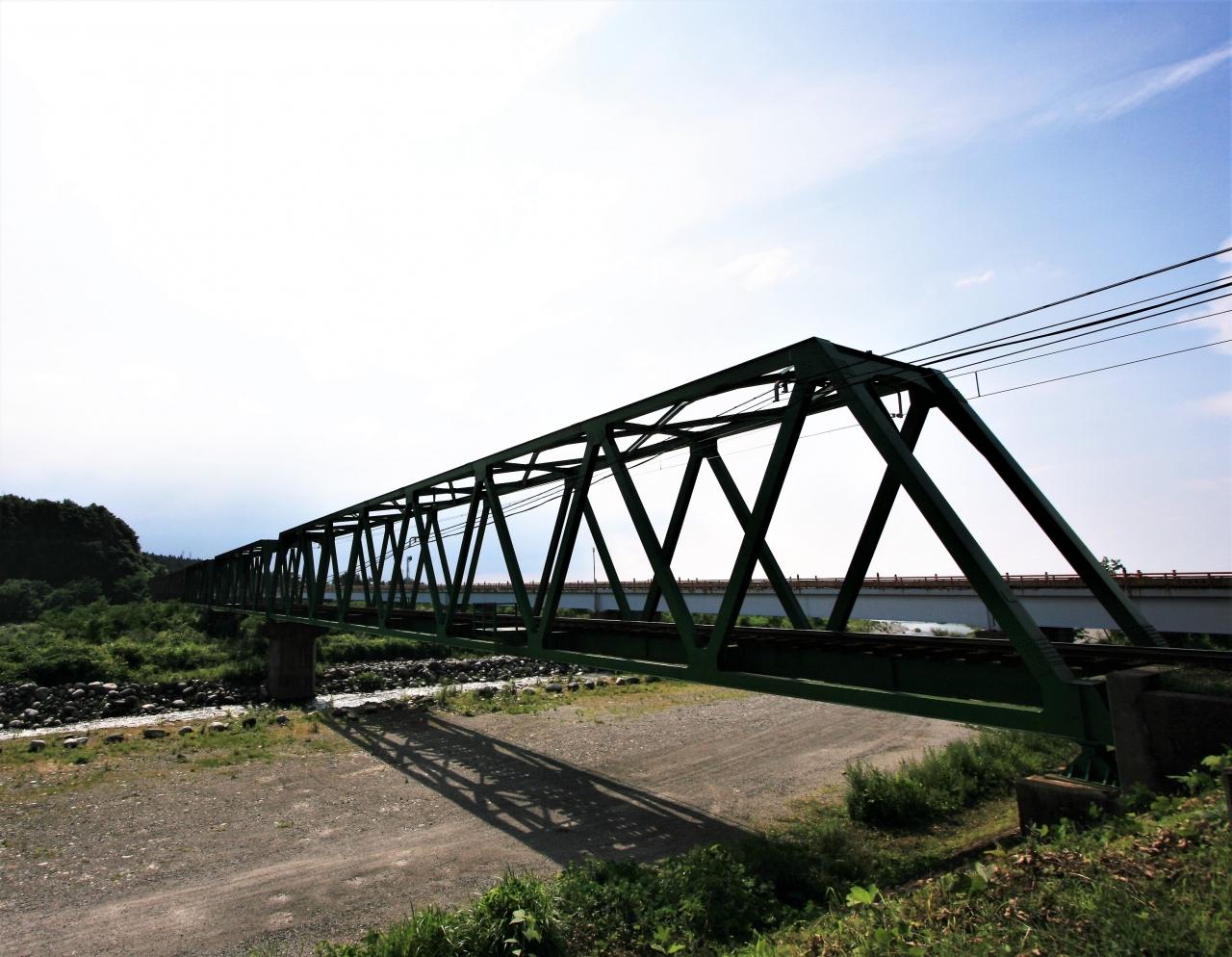 橋の途中から常願寺川に架かる真川橋梁(富山地方鉄鉄道)を試し撮り。