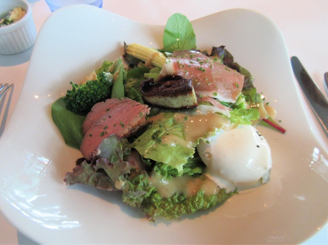サラダにフォアグラや生ハム、カモの燻製、ポーチドエッグなどが乗っていて、盛りだくさん。素材の組み合わせも大胆で、ボリュームもあるし、これだけでもとても満足でした。 -