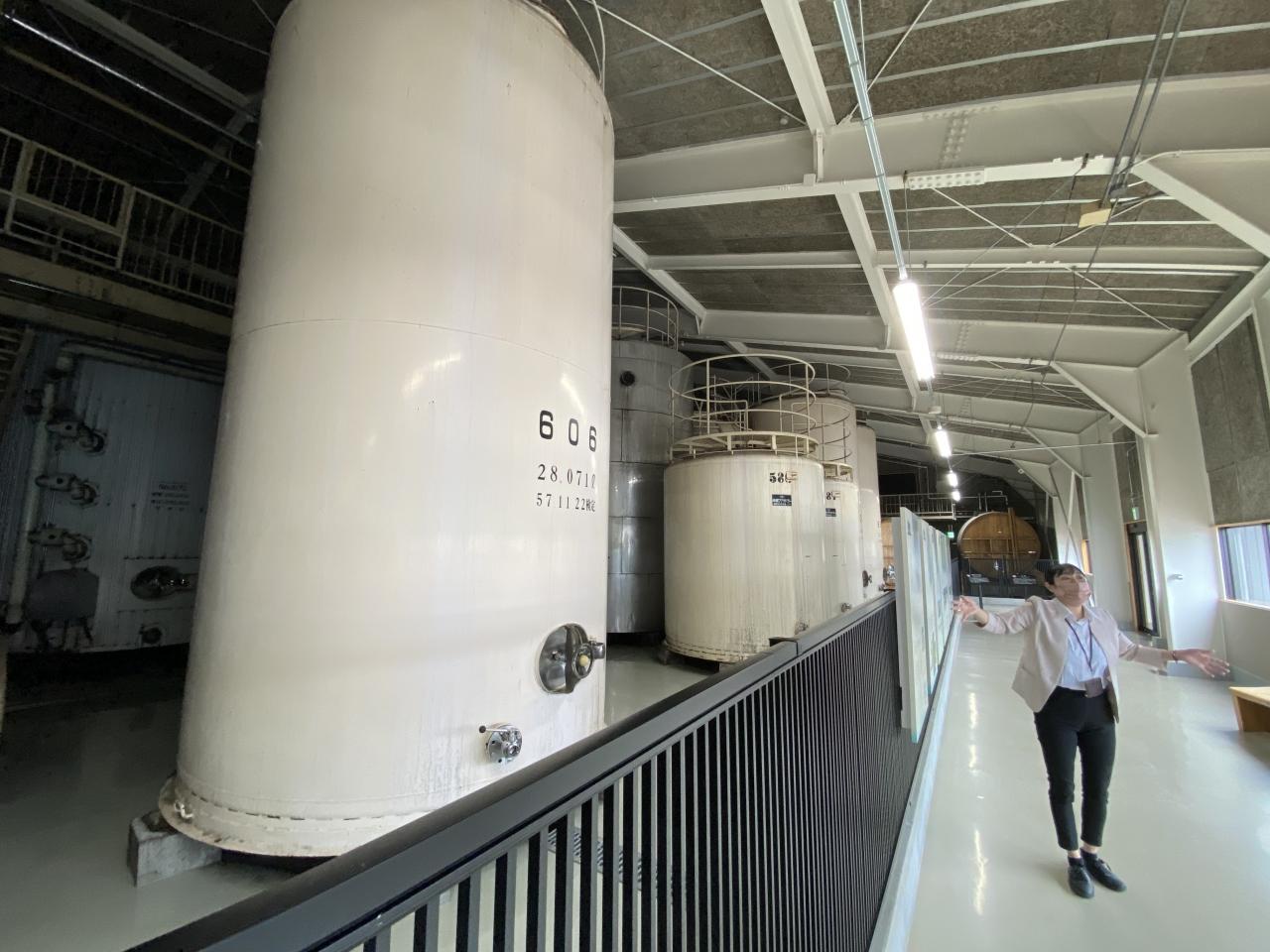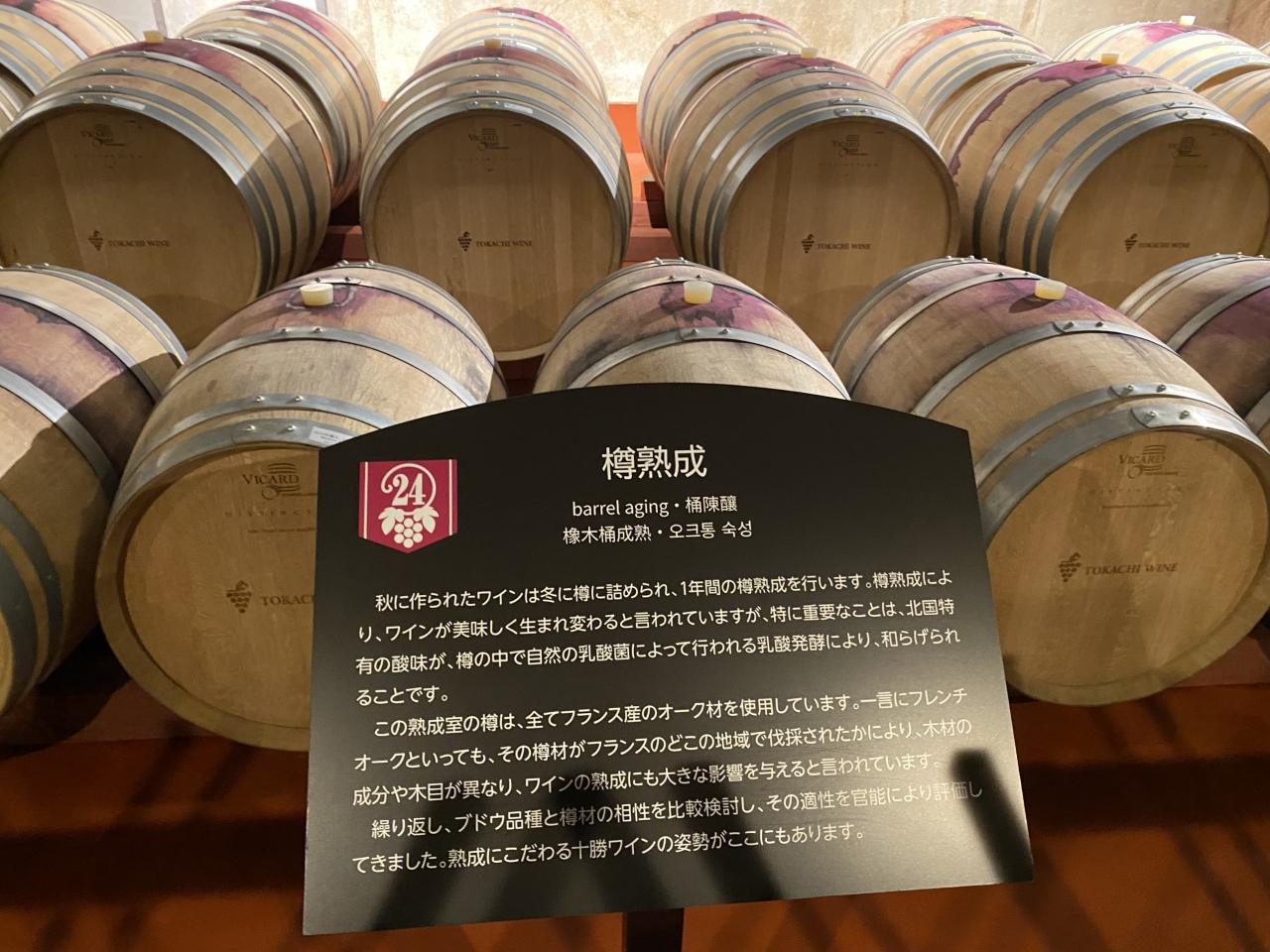ワインの大きな樽。池田で作られるブドウはもともと当地にあった寒さに強いヤマブドウとの掛け合わせで出来たブドウで作れるようになったそうです。それでも冬を越せないため、いちど木の枝、蔓を冬は地面に埋めてしまうのだとか。春にまた掘り出してと大変な労力