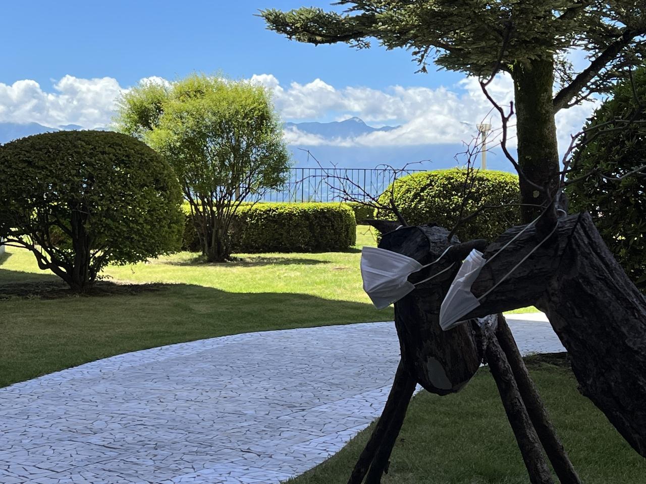 食後に朝風呂に入り部屋でのんびり、10時にチェックアウトしました。庭園の鹿達がマスクしています。早くマスク生活が終わると良いですね。
