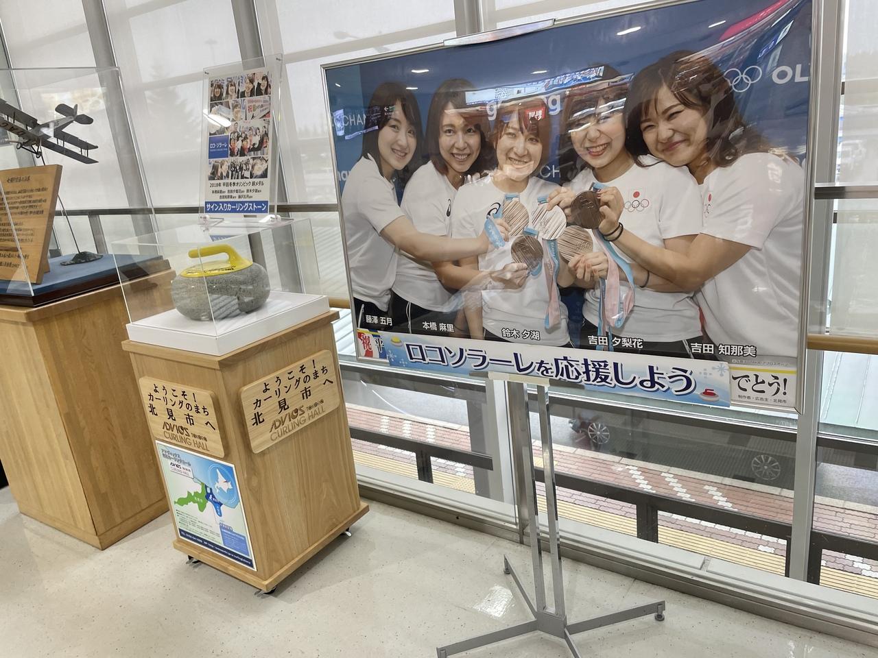 2階の出発ロビーへ上がると、ロコ・ソラーレのパネルとカーリングストーンの展示がありました。