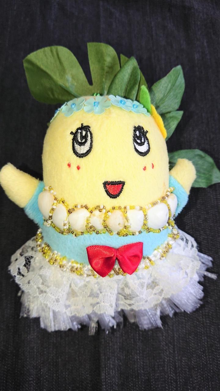 前に南国仕様で作った「ふなっしー」にレース・花型のスパンコール・モンステラを付けて、更にハワイ感をアップしますた。