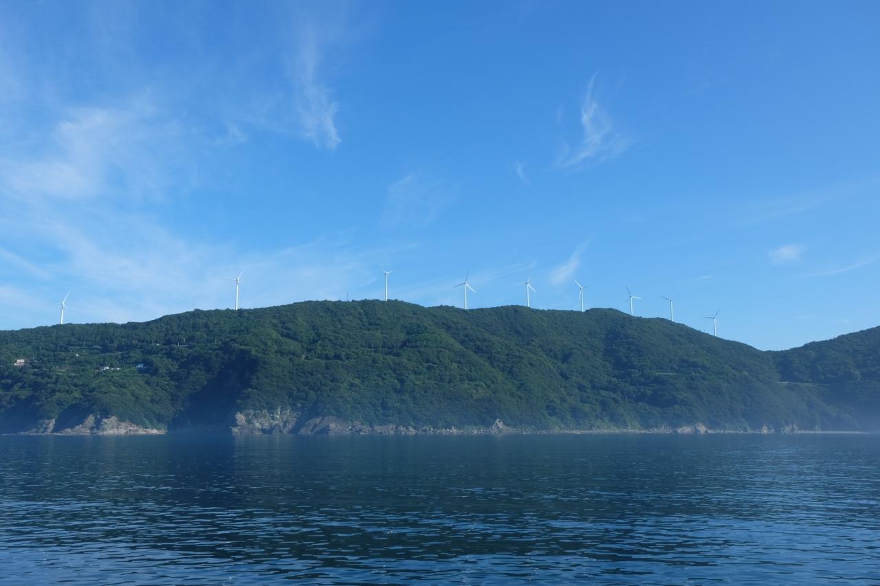 佐田岬のシンボル 風力発電の風車も青空に映えています。