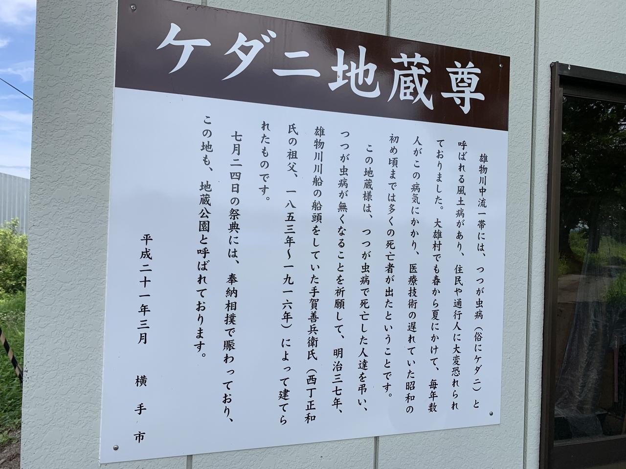 この地蔵様は、つつが虫病で死亡した人達を弔い、つつが虫病がなくなることを祈願して、明治37年、雄物川川船の船頭をしていた手賀善兵衛氏によって建てられ、地元の人たちには「ケダニ地蔵」として知られています。 -