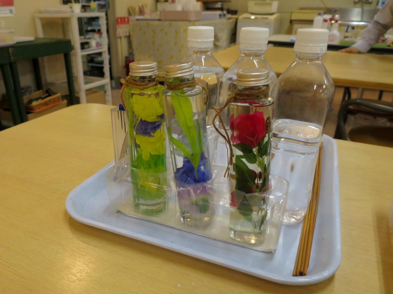 造花、ガラス容器、ベビーオイルを調達すれば、家でもできます。