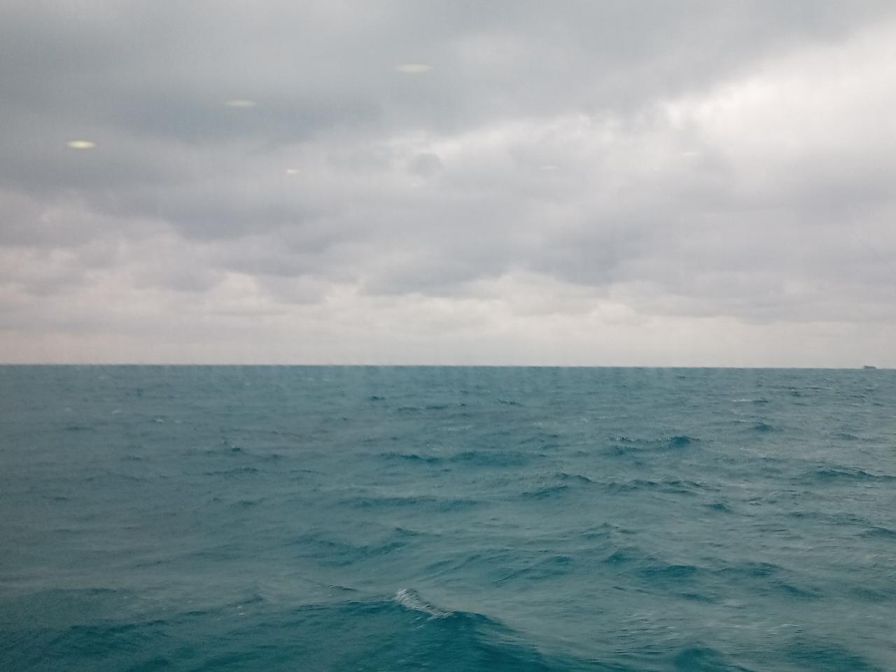東側でしょうか。曇り空にもかかわらず海が結構艶やかで水色で美しく見えます!小さな嘉弥真島が見えますね!