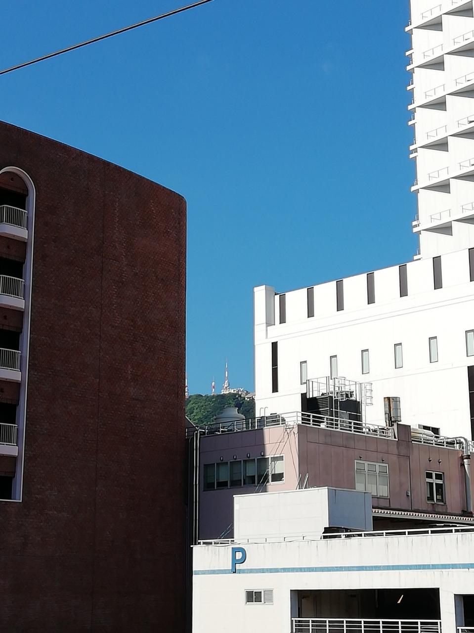 浦上駅のホームから。ビルの隙間に稲佐山の電波塔が見えます。