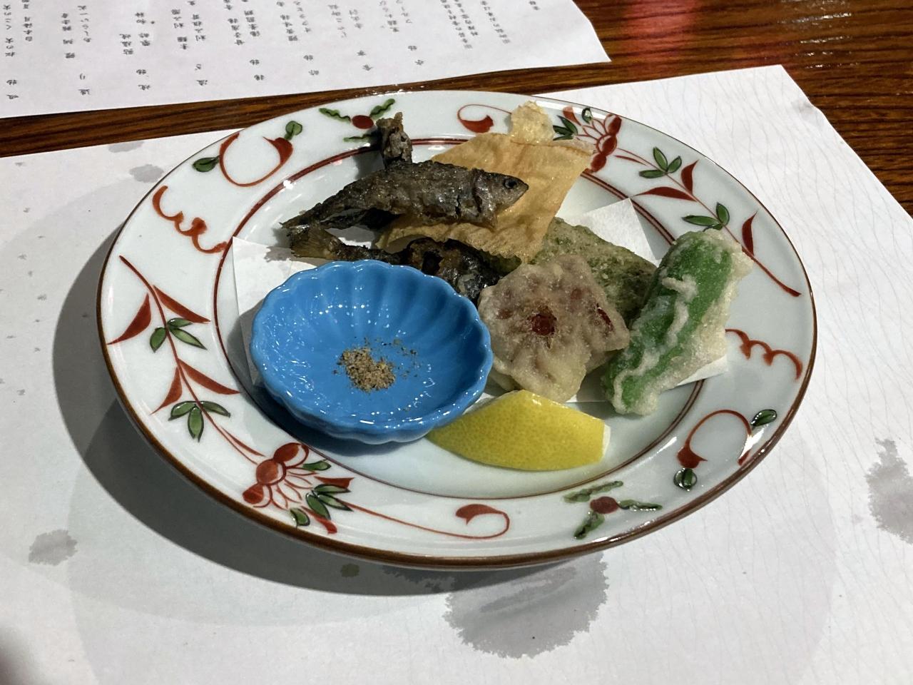 甘子唐揚、青唐、猪肉肉詰蒟蒻、湯葉煎餅、栗麩を柚子胡椒やレモン、塩で頂きます。 -