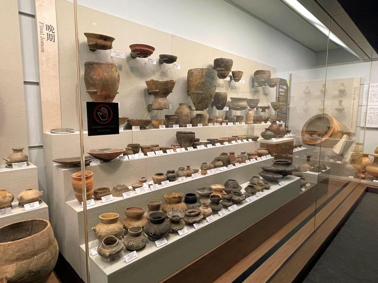 土器の時代区分ごとの展示。本当に展示量が多くて圧倒されます。前期の土器を見ると、結構歪んだものが多く、最初はうまくいかなかったものもいっぱいあるよね、とちょっと親近感がわきました。