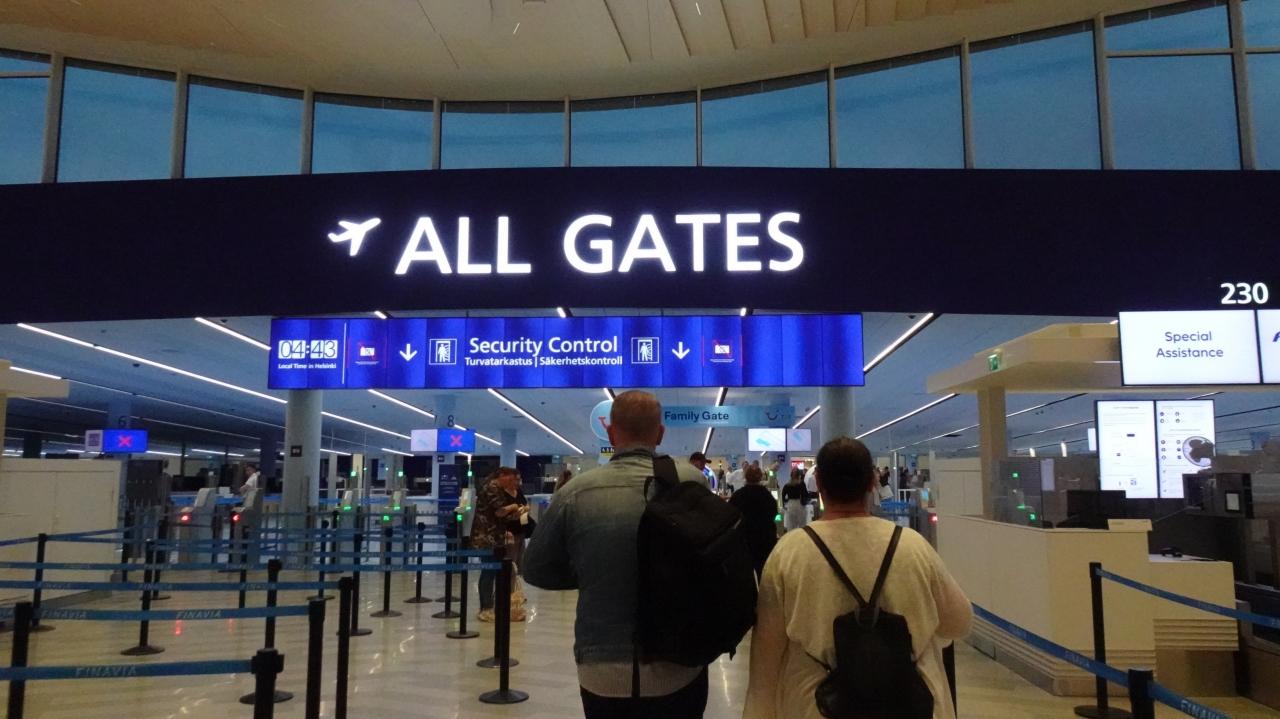 出国フロアは2階にまとめられています。中央の「ALL GATES」の入り口を中心に、右側にナショナル・フラッグ・キャリアのフィンエアーの受付カウンターが並びます。左側にはその他の海外航空会社のカウンター、中でも就航便数が一番多いルフトハンザ航空のスペースが大きいです。日本航空は1日1便ですが、受付カウンターは中央入口のすぐ左の目立つ所にありました。
