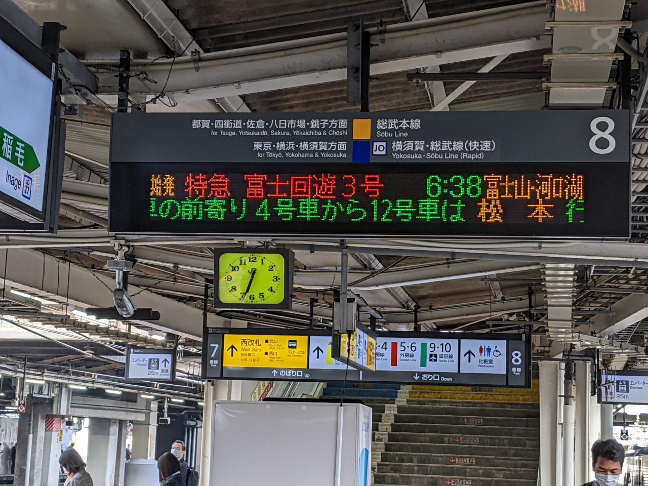6時38分、千葉駅発の特急「あずさ3号」松本行に乗車します。