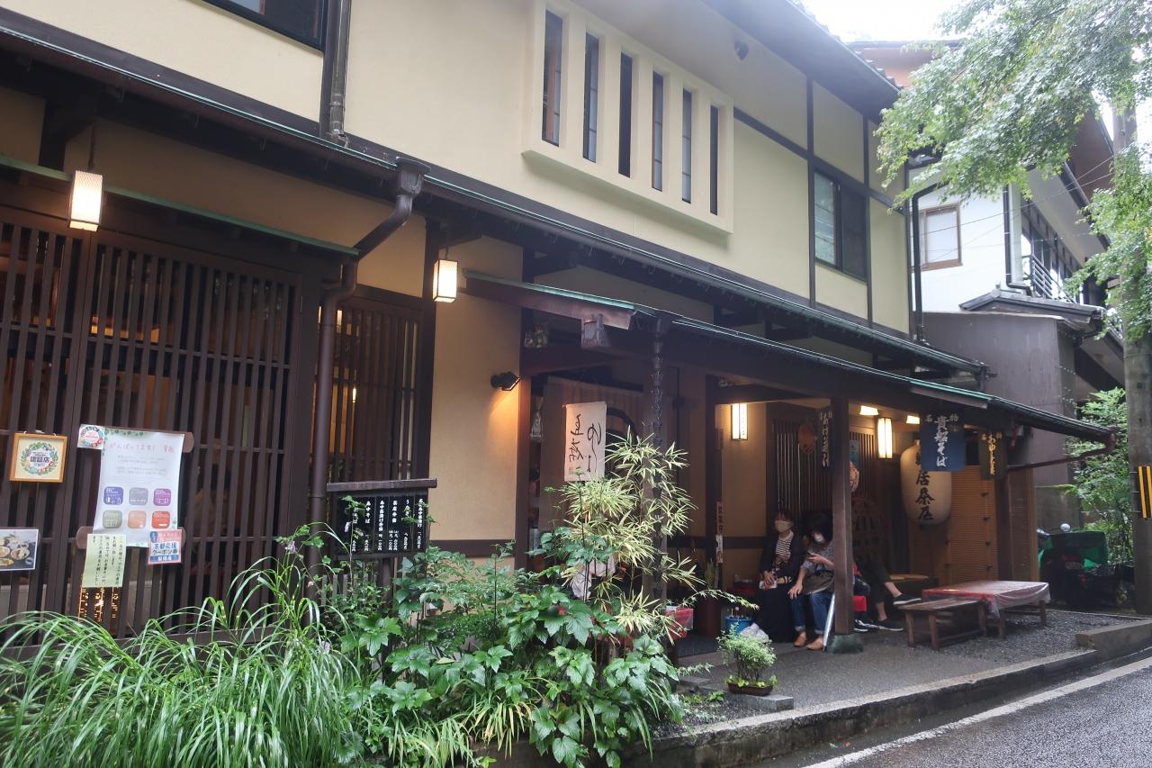 お昼は川床で懐石料理を、と思っていたのですが、断続的に降る小雨で増水の危険があるため、川床はすべて休業でした。 -