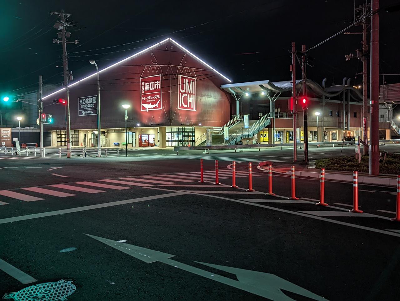 街灯がチラホラあるので真っ暗けというわけではないが、漆黒の空と海が静かに広がるだけ。 -
