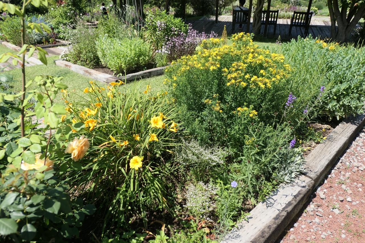 至るどころにオレンジ、紫、ピンク、白などの薔薇が初夏の草花と組み合わせて見事な景観。