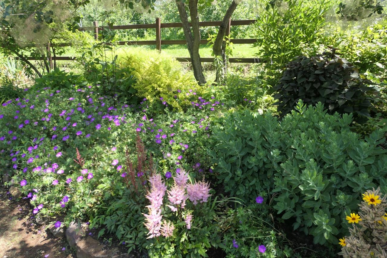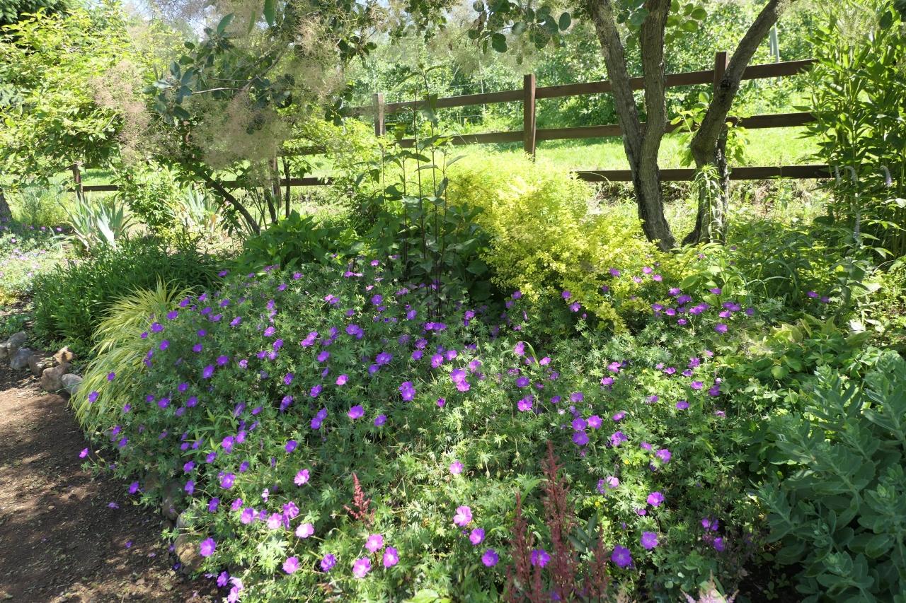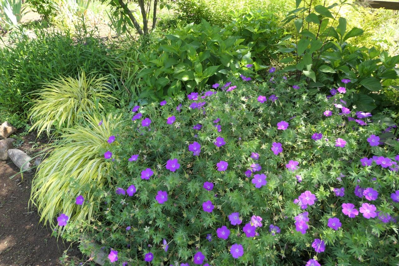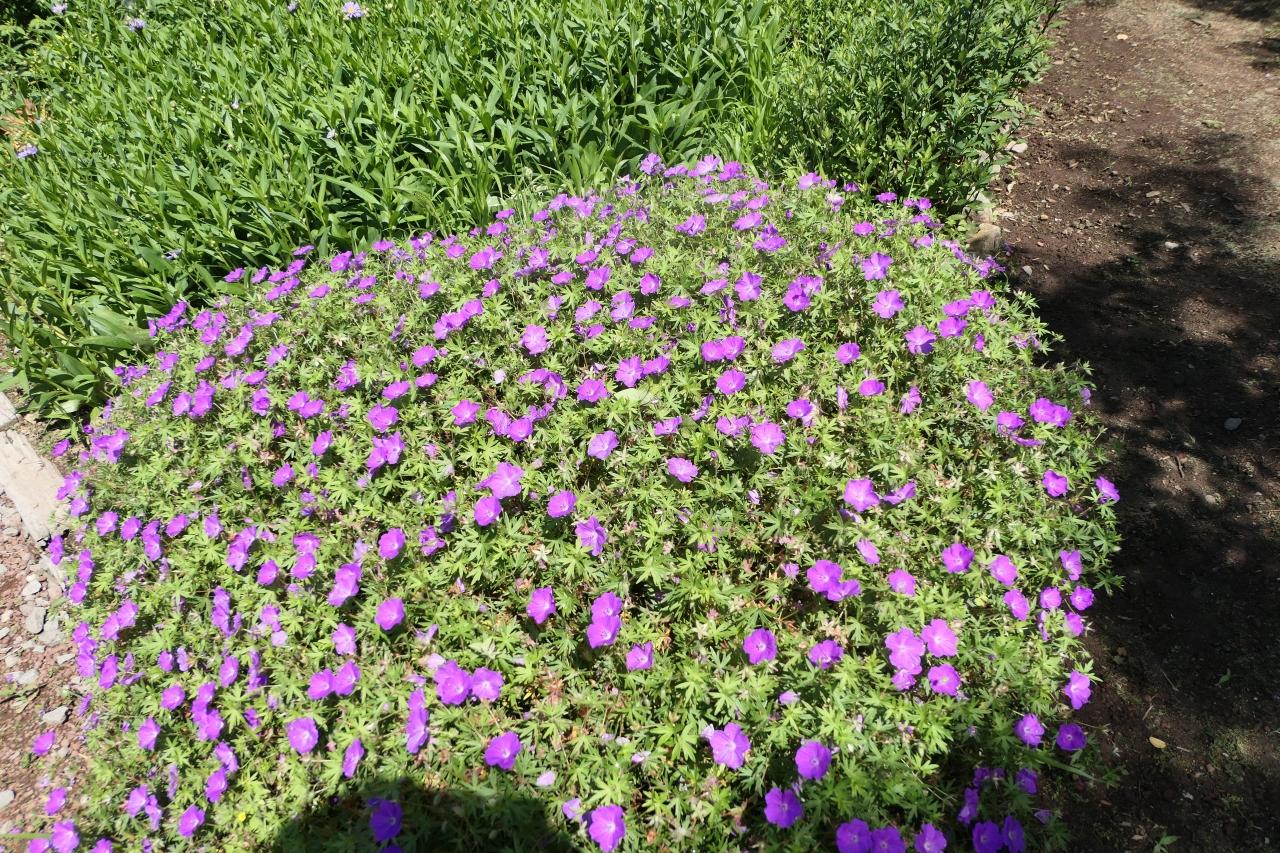 至るどころにオレンジ、紫、ピンク、白などの薔薇が初夏の草花と組み合わせて見事な景観。