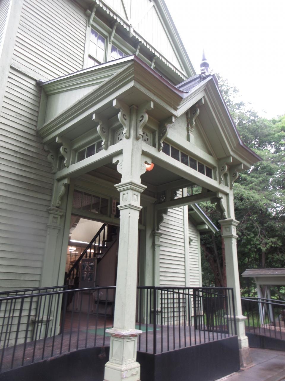 博物館の本館の玄関です。明治15年に竣工されています。とてもモダンな建物だったのでしょう。正面中央に、片流れで軒先を三角の破風形にした玄関ポーチです。明治時代の建物が残っているということは、すごいことだと思います。