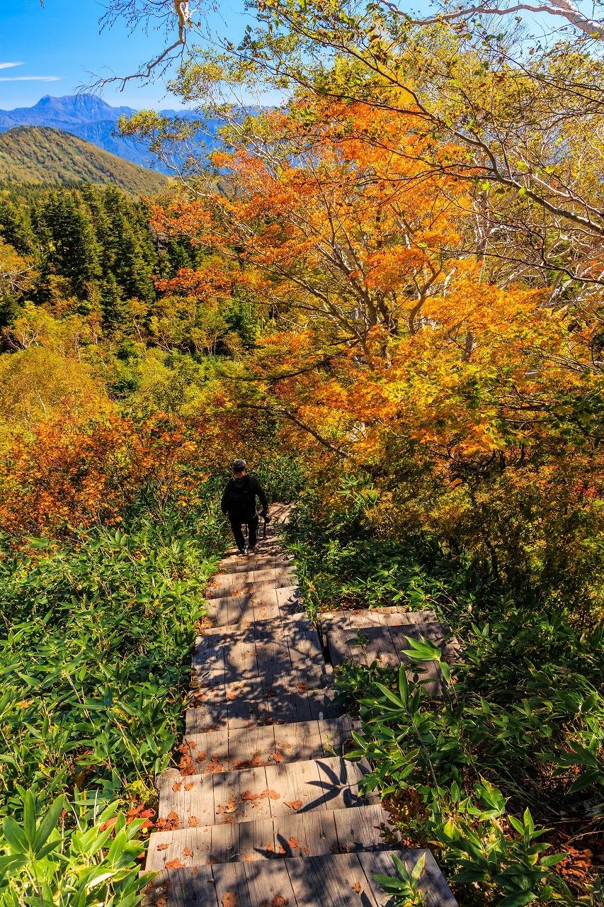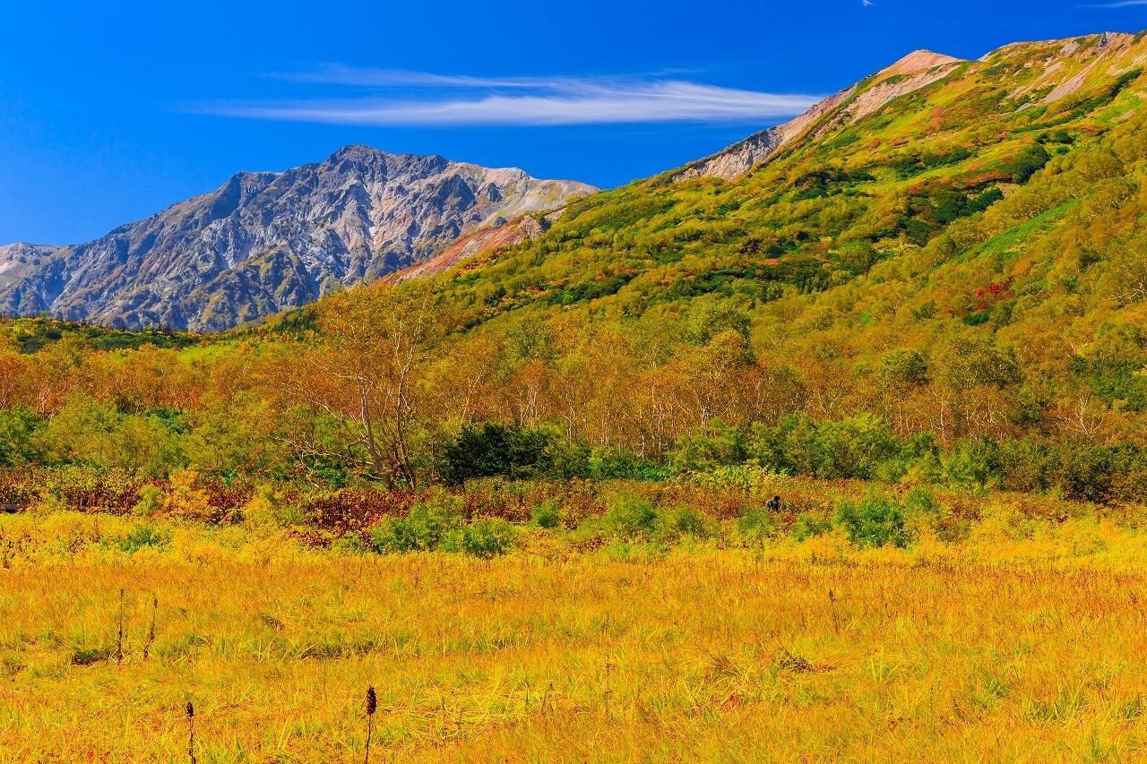ロープウェイ内のアナウンスでは、今年は例年に比べ1週間ほど紅葉が遅れており、現在の見頃は「浮島湿原」より上部ということだったので、先ずは浮島湿原を目指して歩を進めます。「ワタスゲ湿原」では、木道の工事で通行止め。湿原の縁に沿った迂回路を通ります。雲一つ無い快晴の空の下、色付き始めた斜面の向こうには「白馬三山」が聳えています。