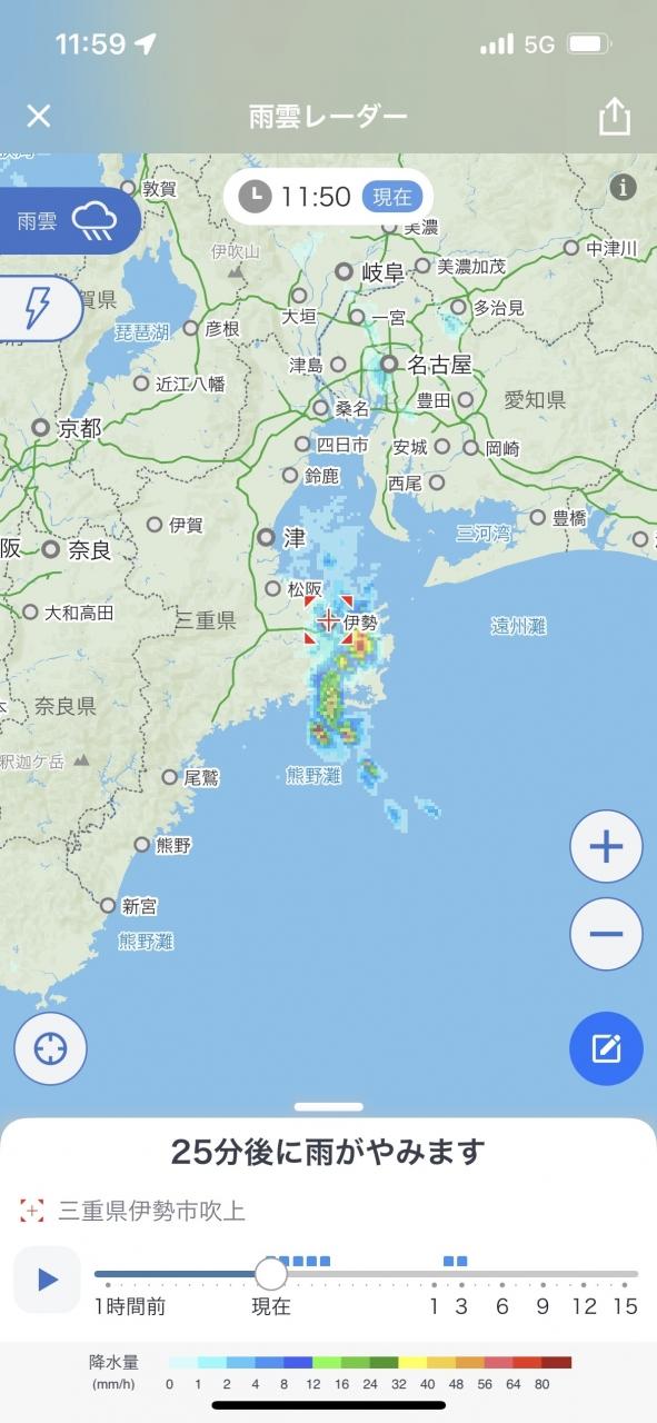 雨雲レーダーを見てみたら伊勢だけ雨雲が…。