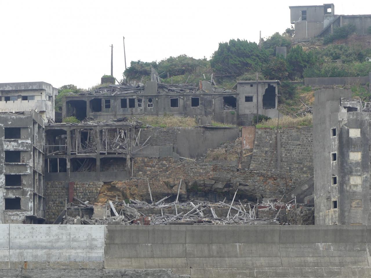 正面のレンガ象造りの建物は、炭鉱の総合事務所だったものです。端島炭坑 名所・史跡
