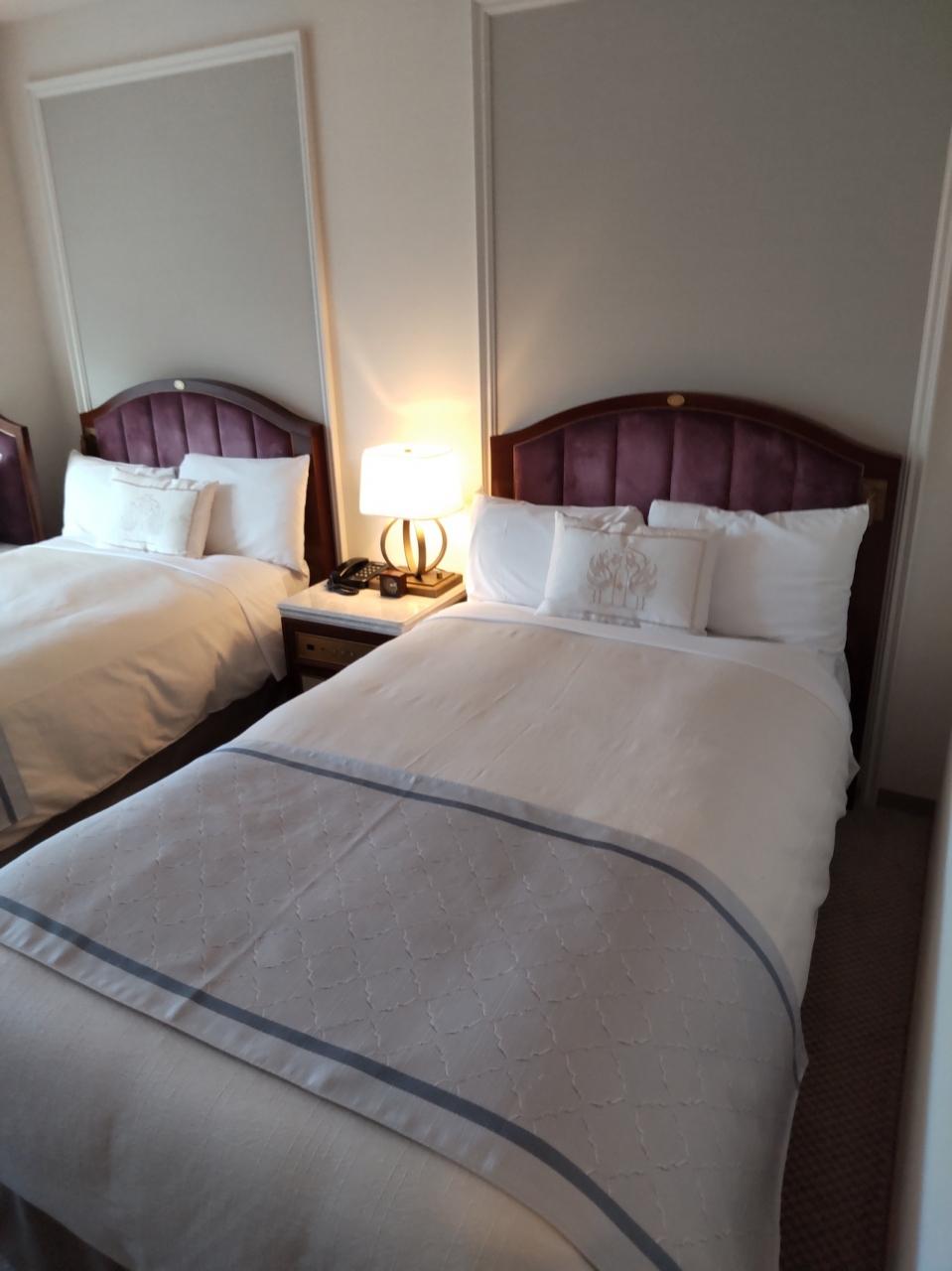 スーペリアトリプルのツインユースです。ベッドは真ん中を空けて窓際と壁側を利用しました。壁面、天井がアールデコ調になっています。
