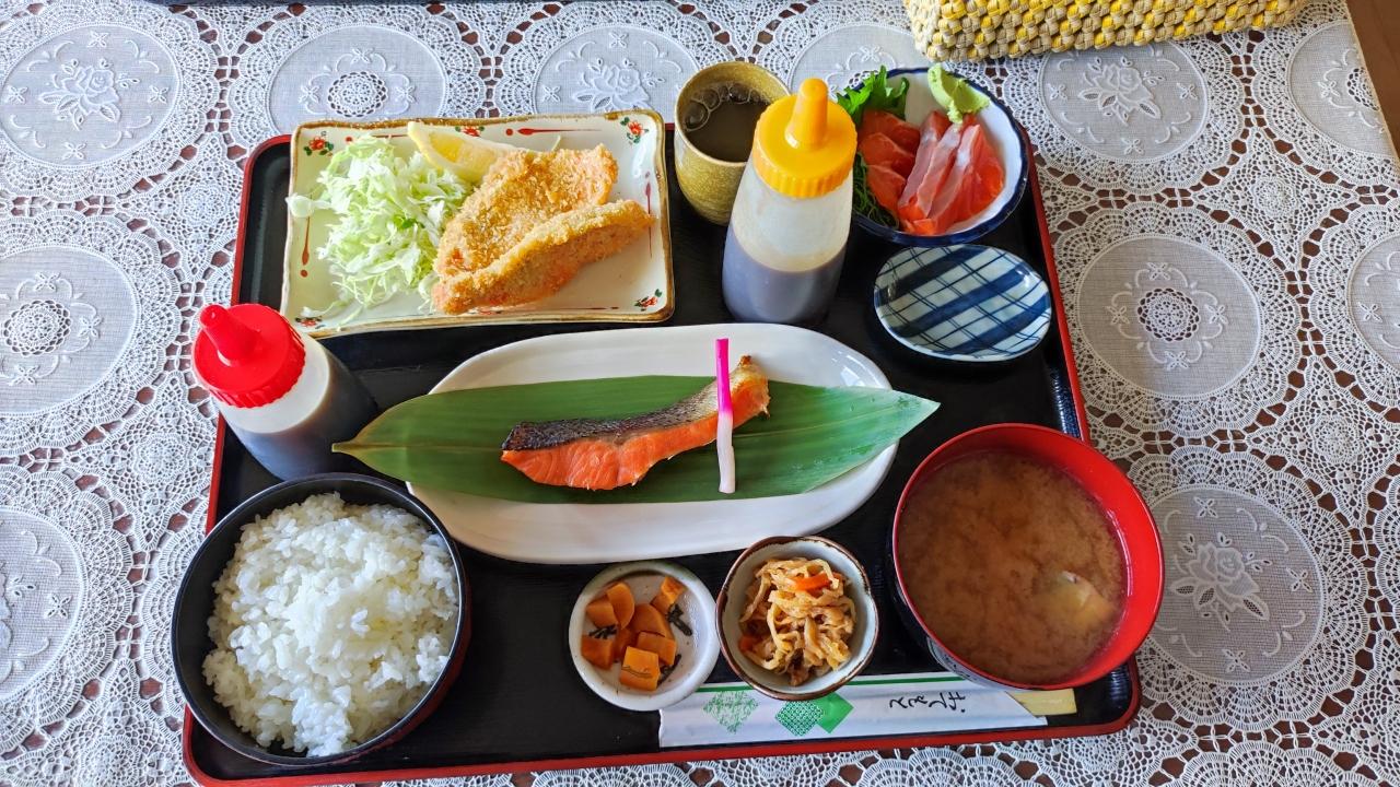 プレミアムシオヤマス定食がやってきました。セルフサービスなので、カウンターに取りに行きます。出来上がるまで20-30分くらいかかるので、急いでいる人は気をつけましょう。