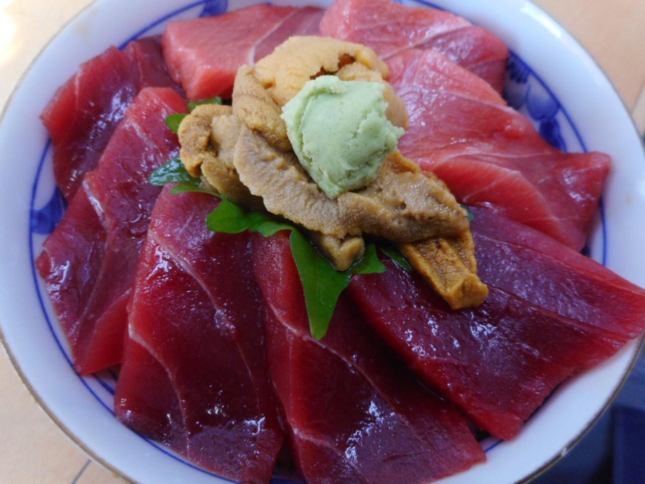 手前が赤身で奥がトロです。そして真ん中に大間産のウニです。