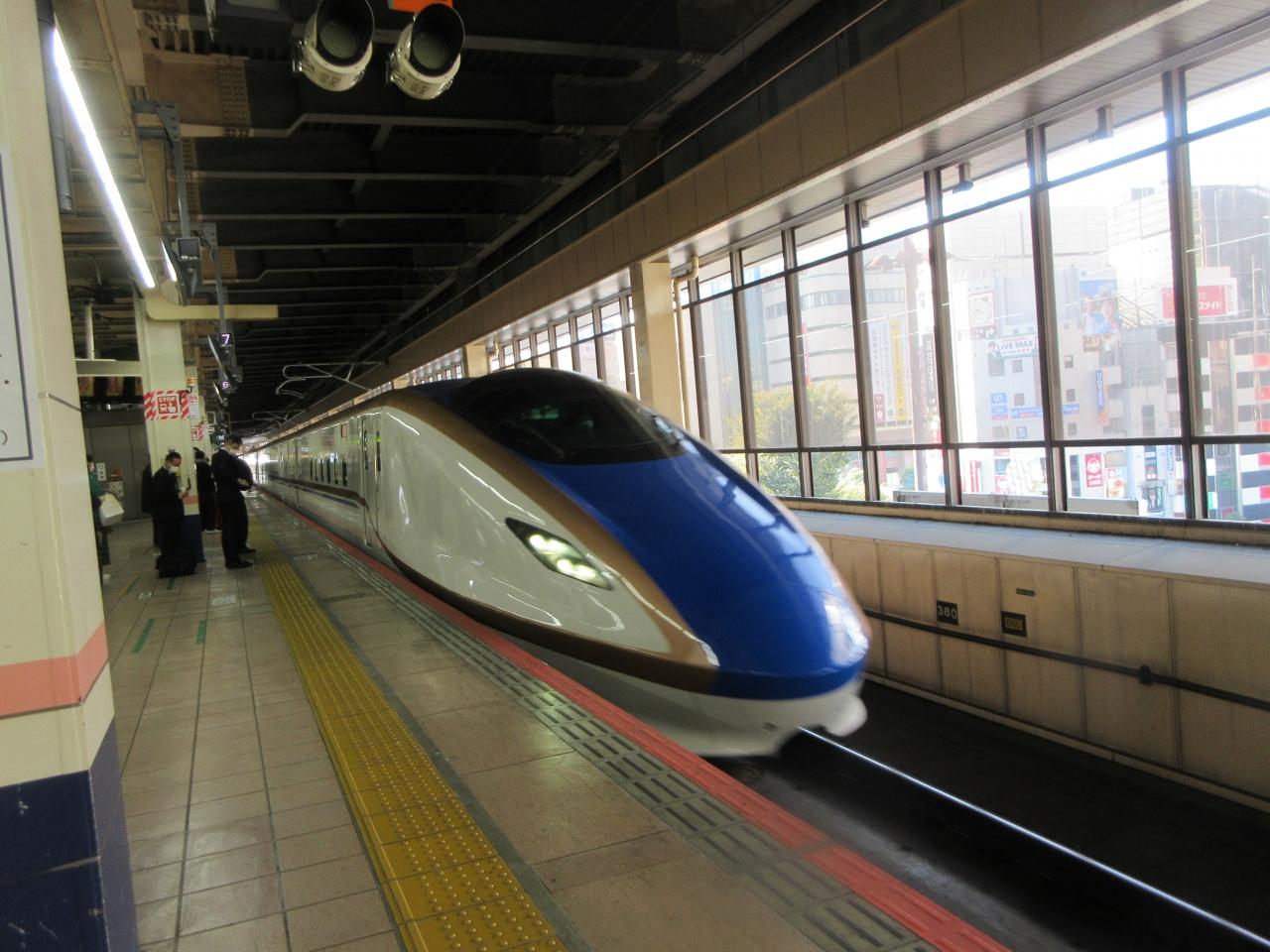 大宮駅で「とき309号」新潟行を待っています。その前の電車は「はくたか」で金沢行です。同じホームに上越新幹線と北陸新幹線が入線するということがとても不思議に思われます。日本の鉄道技術がすばらしいんですね。