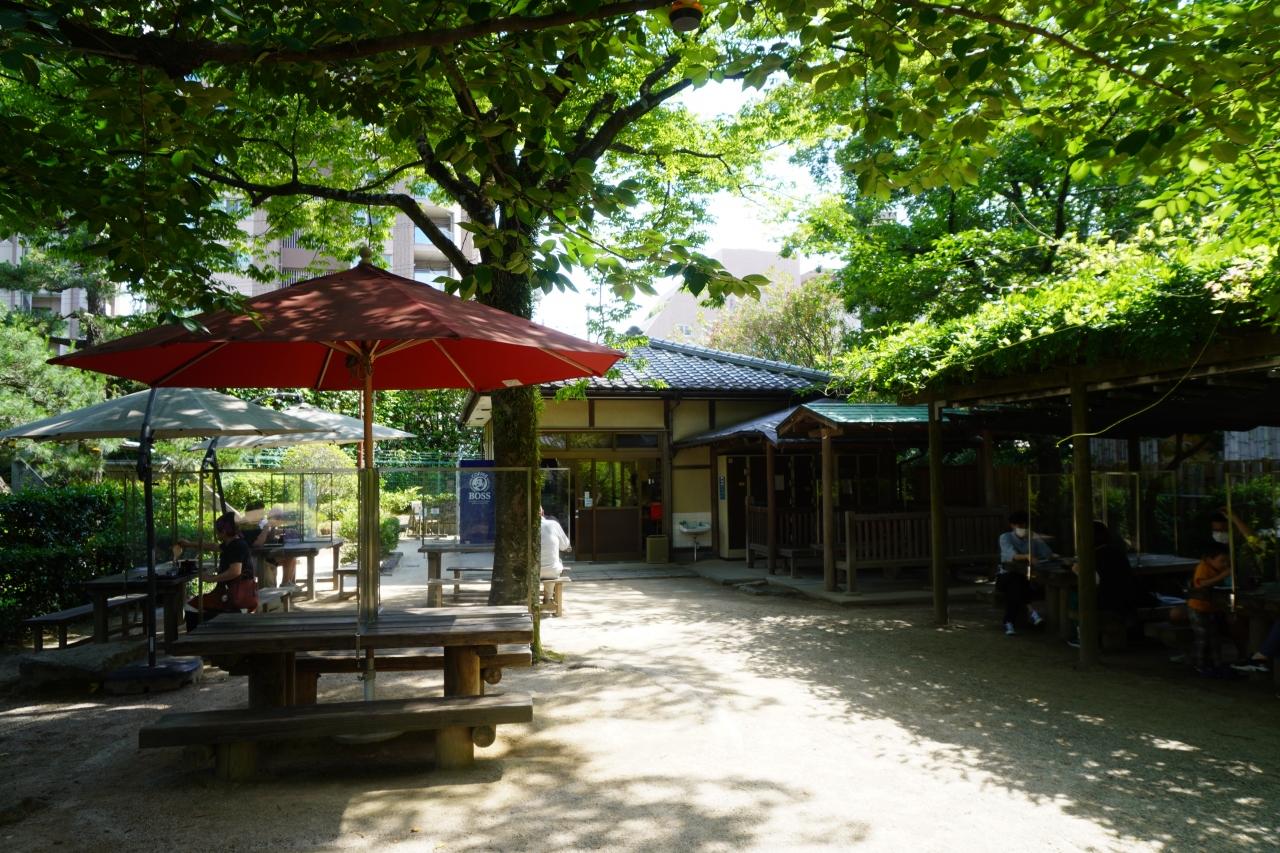 こちらは売店とお茶屋さんを兼ねる施設。庭を眺めながらのシチュエーションではありませんが、それなりのスペースに野外の席がいくつか並んで、この開放感は悪くはないですね。