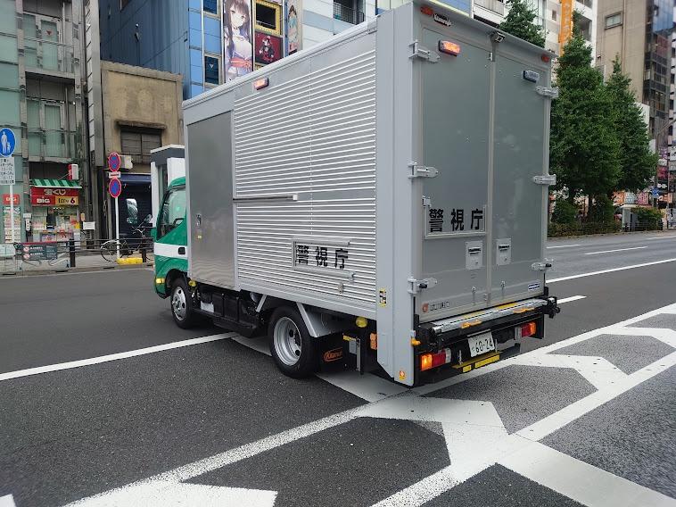 秋葉原の歩行者天国の末広町駅側にある「バリケード」。警視庁、と書かれているので、他の用途はあまりなさそう・・・というか、これで乗り付けて中から機動隊がぞろぞろ出てくる、なんてないな。ちなみに、もちろんだが、すぐに対応できるようにアイドリング状態で運転手も乗っている。