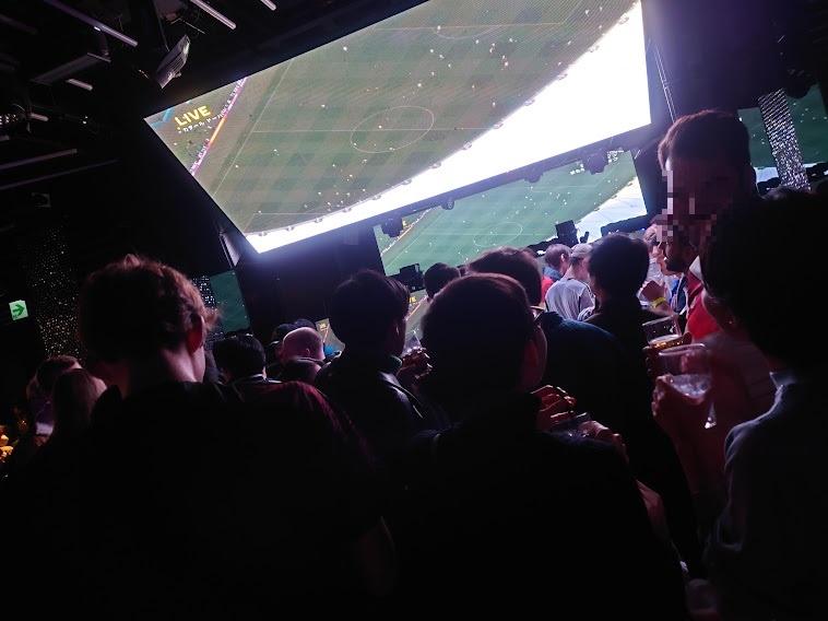 ドイツ-日本戦をやった某スポーツバー。ドイツサポーターの集い、というテーマで集客しているので、ドイツ人を含めた外国人が6割くらい。この人数、外国人で8割方ノーマスク、というのは3年ぶりであった。東京・渋谷にて。