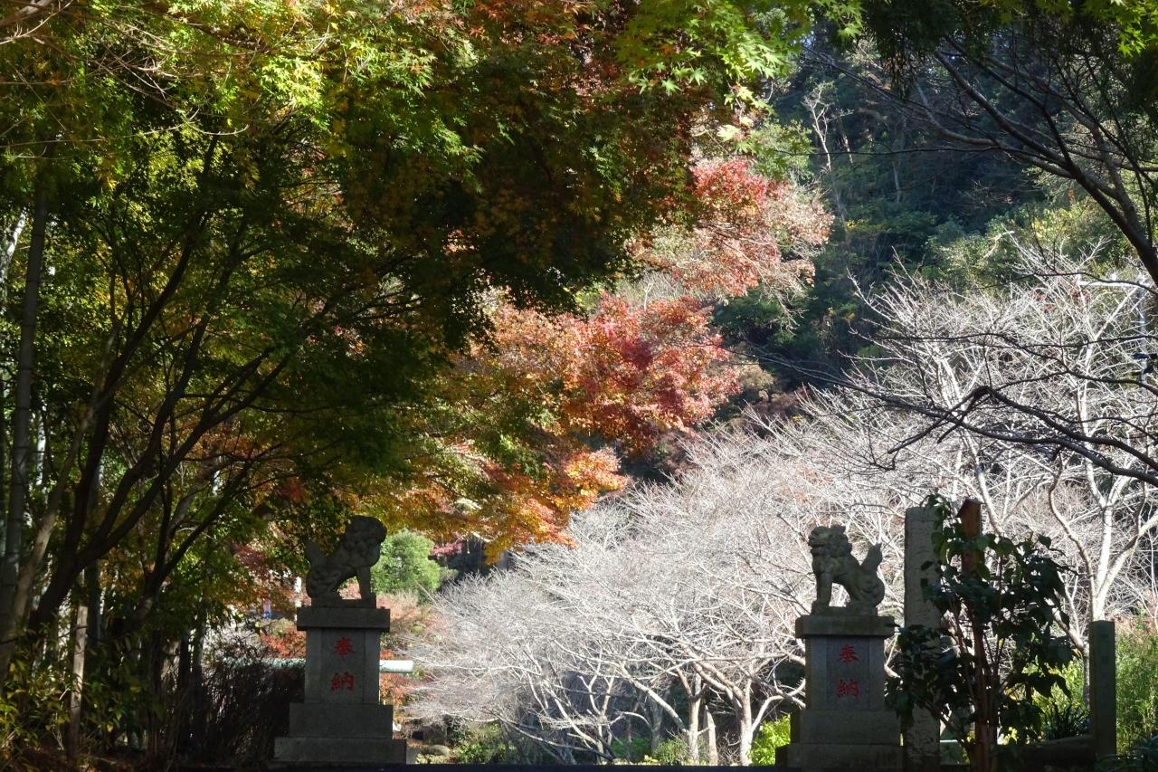 狛犬が紅葉をバックに