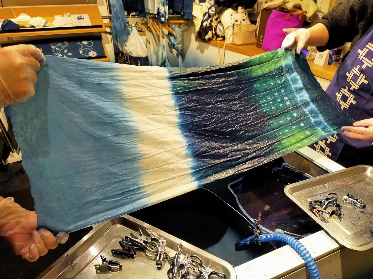 それを染めていきます。スタッフの方から言われるがまま沈めたり引き揚げたりを3回ほど繰り返します。