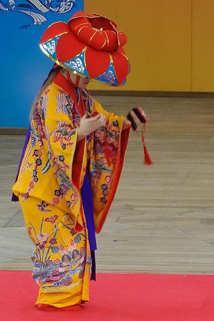 エイサーの太鼓の合間に琉球舞踊も見ることが出来ました。女踊りの「四つ竹(ゆつぃだき)」は四つ竹という打楽器の澄んだ響きに合わせ華やかな衣装と大輪の花笠を被って演じられる祝儀舞踊です。
