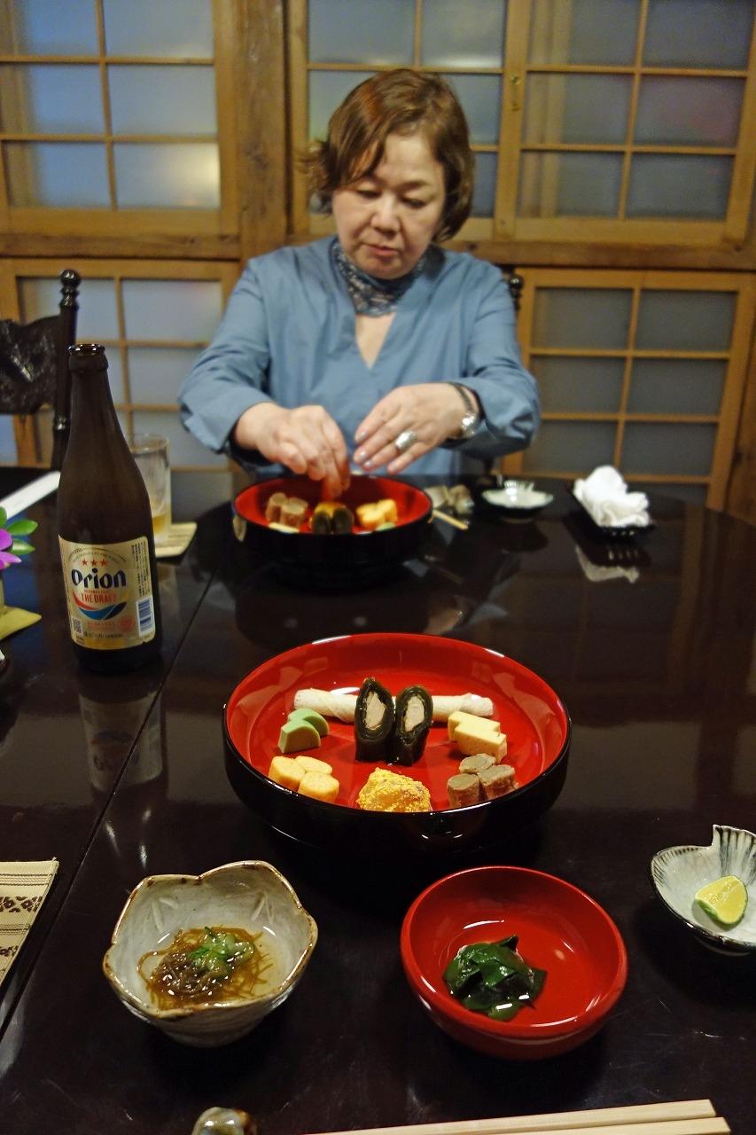 「東道盆(とぅんだあぶん)七品盛り」の東道盆とは盛り付ける器のことです。2人だとこのような琉球漆器のお盆に盛られますが、大人数だと重箱のような専用の容器に盛られます。一番奥が「ぽうぽう」というメリケン粉を水で溶かし薄く焼き、すり潰した豚肉と白味噌生姜を練ったものを芯にして巻くクレープのような料理です。奥の左から「蒸しかまぼこ」は魚のグルクンのすり身にからし菜の搾り汁を加えて蒸した緑色のかまぼこです。中央が「昆布巻き」で、おもにカジキマグロの身を昆布で巻いて醤油、砂糖、酒で煮付けたものです。右が「カステラかまぼこ」で、魚のグルクンのすり身に卵を加えて焼き上げたかまぼこです。手前が左から「揚げかまぼこ」で、これも魚のグルクンのすり身に人参の細長くすりおろしたものを加え揚げたものです。中央は白身魚に黄身のそぼろをまぶしたもので、右は「牛蒡の肉詰」で、豚肉をチョップしてすり身のようにしたものに人参、椎茸のみじん切し芯をくり貫いた牛蒡に詰めだし汁で煮込んだ手の込んだ料理です。