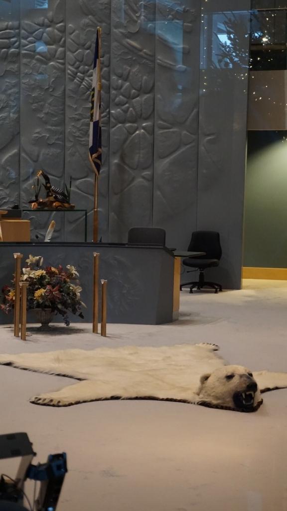 大きな白熊の毛皮が敷かれています。此れはかつて原住民の権利を保障する約束を反故にした経験から戒めの為に今でも置かれているとか何とか? -
