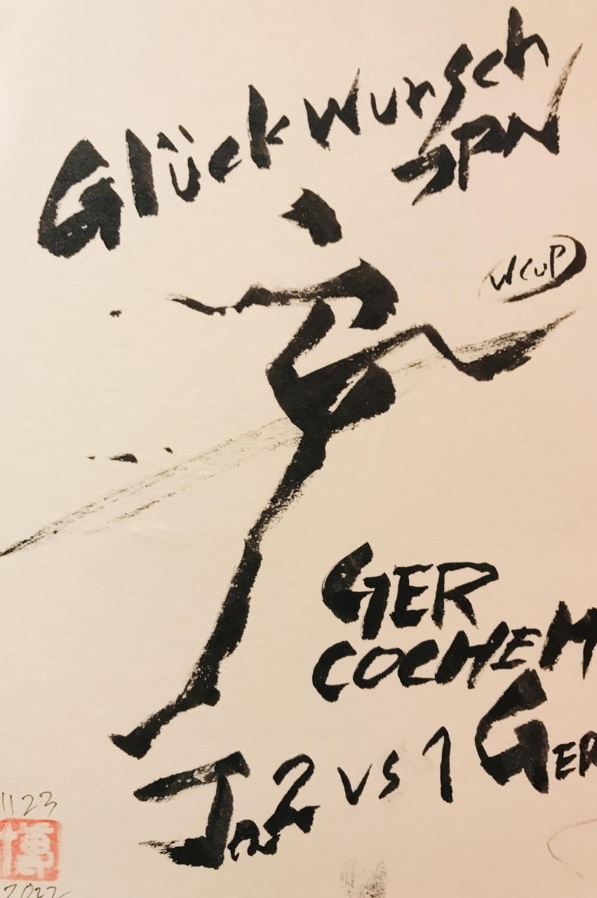 JPNのJとGERのGでキックのイメージで午前に描いた絵ハガキにドイツ語で「おめでとうJPN」と描きました。敵地ドイツでの勝利は格別でした。それも初戦で。いいデザイン文字ができたのでいっぱい描いてしましました。 -