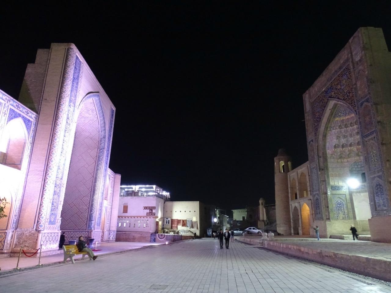 思いがけず、有名なナディール・ディヴァンベギ・メドレセに出くわした。ライトアップがちょっとキツイかも・・・。ナディール ディヴァンベキ メドレセ 史跡・遺跡