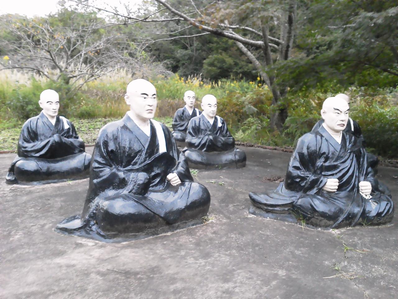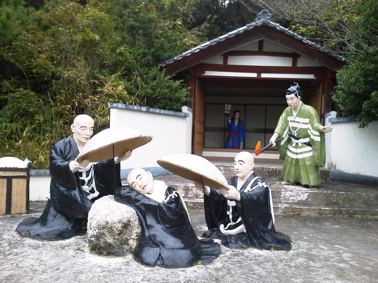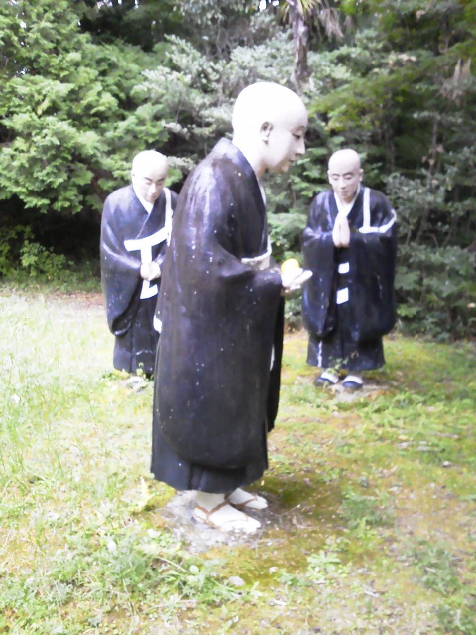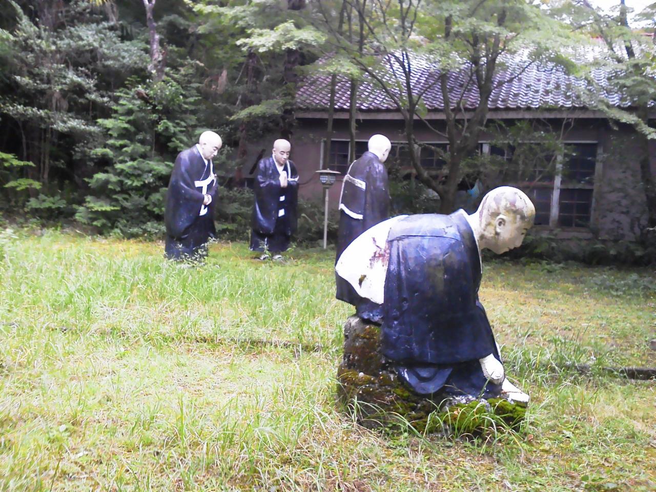 熱中症の坊さんをキノコで扇ぐ坊さんたち