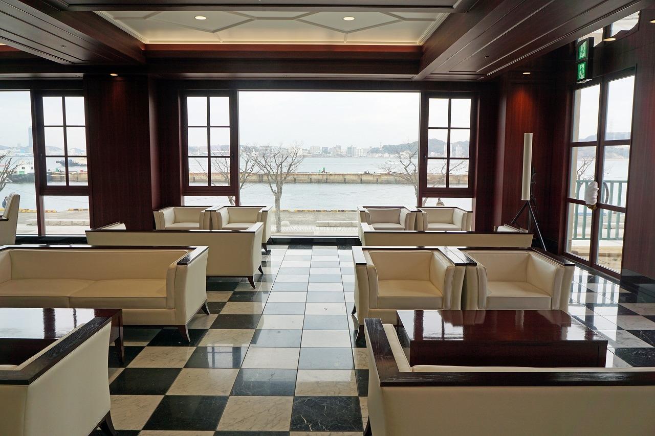 解放された窓からは関門海峡が美しむ望めます。台湾の団体さんが出発した後は閑散とした雰囲気です。