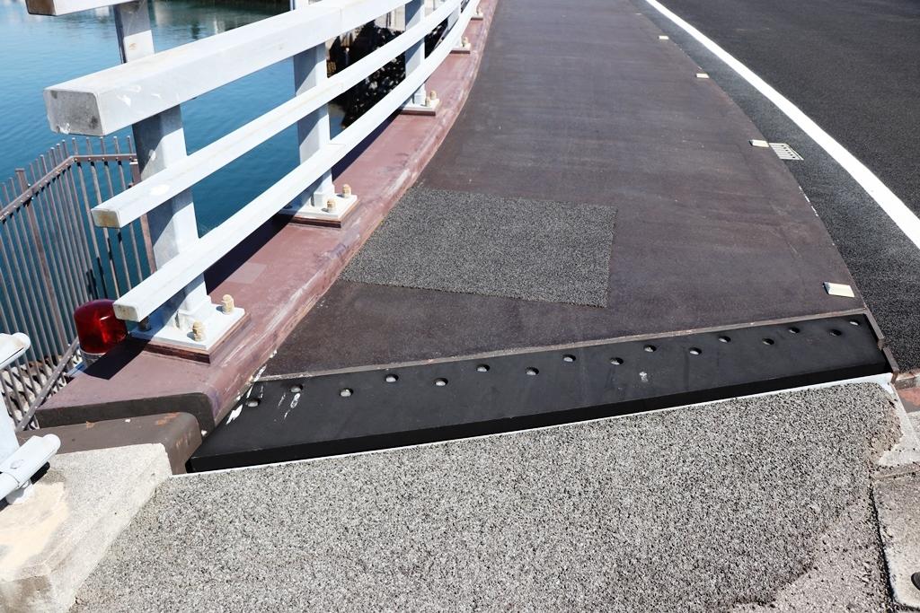 橋が開いた状態のとき見えていた欄干部です。歩道側の欄干には「手結港可動橋 2002.9」の記されていて、連結部には厚目のゴムが取り付けられ綺麗に繫がっています。