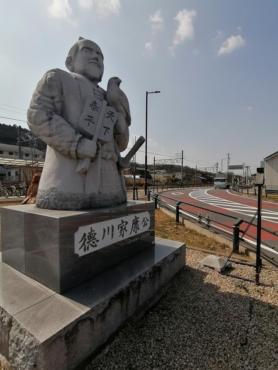 徳川家康像。奥に見えている建物が「道の駅 藤川宿」です