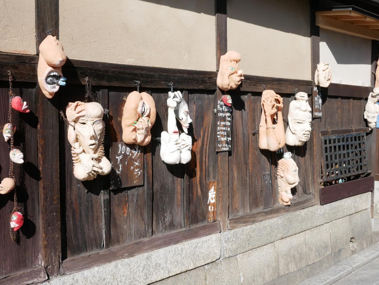 どこかの通りに変なお面が吊るされてました。非常に不気味ですね。