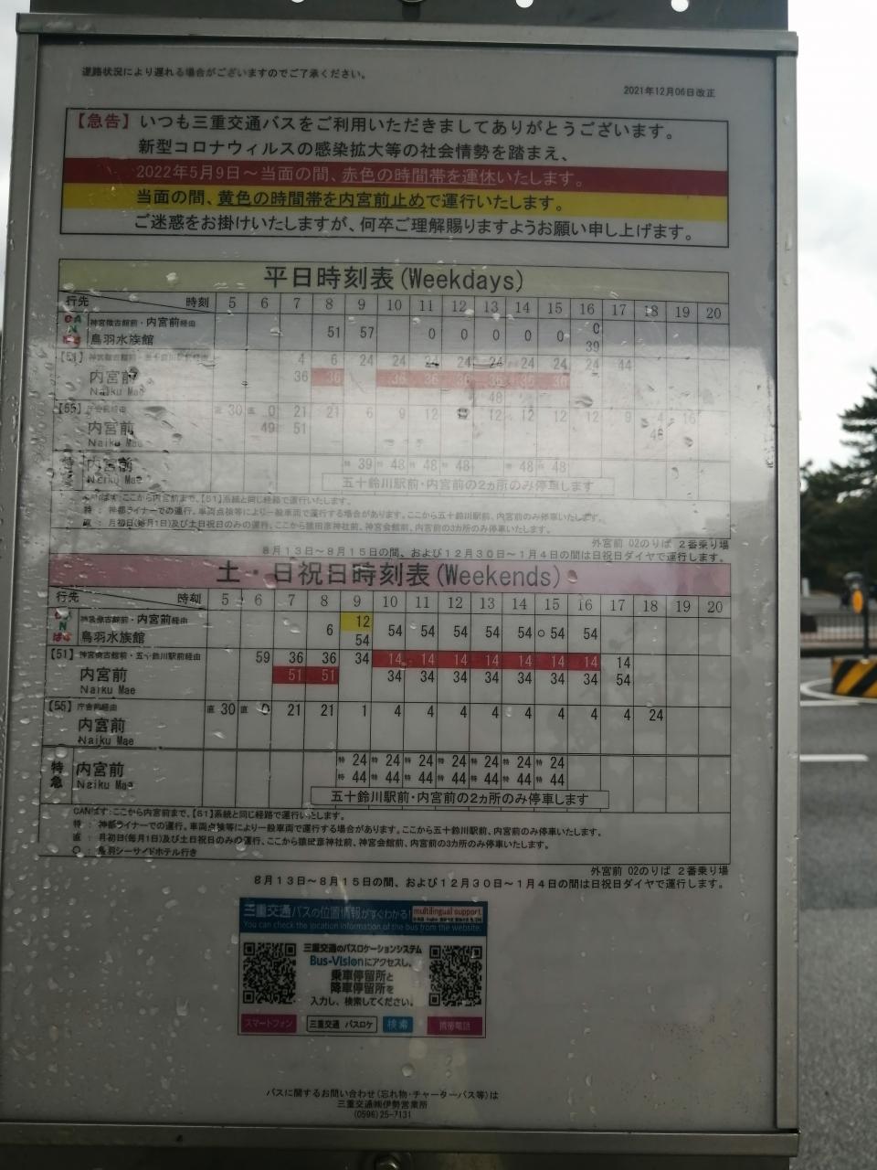 16:14発のバスで内宮に移動しようと思っていましたが赤の帯の時間は運休でした。次のバスは16:34発で20分ほど待ちます。事前に確認したつもりでしたがきちんと見ていませんでした。