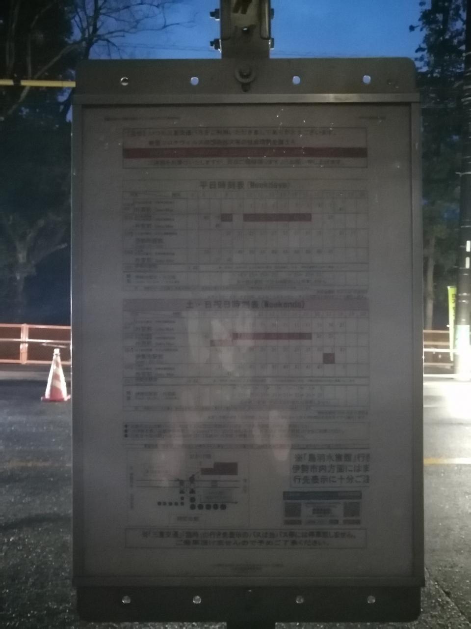 しばらくバスを待ちそうでしたが外宮行のバスが少し待つと来たので乗りました。下宮から伊勢市駅は徒歩10分位だし、暗くなってきて人も少なくなってきたので早めに戻りたいのでまぁいいかなと。