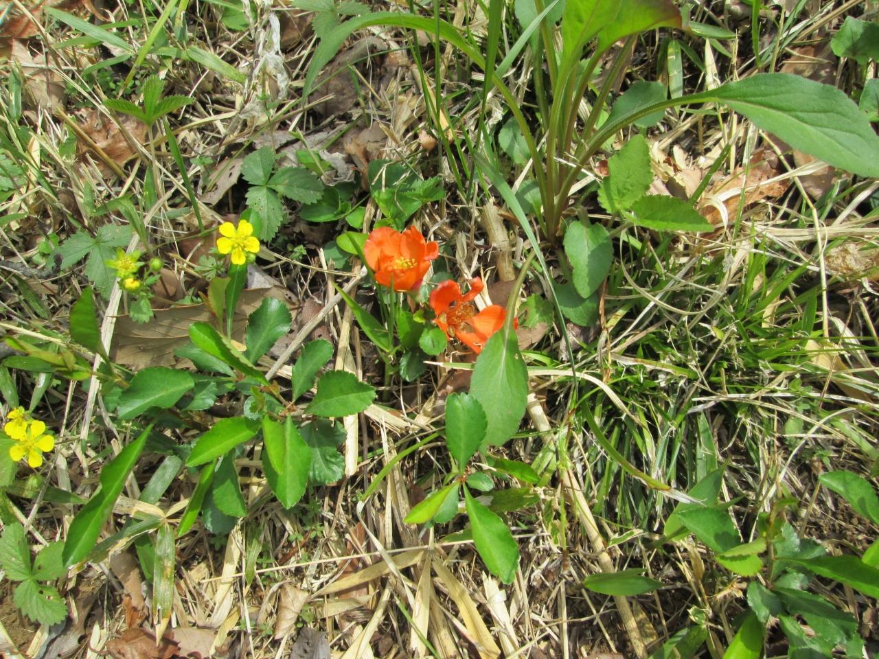 クサボケ 落葉低木で、枝が横に広がり草状に立ち上がる。花は直径3cmほど、一重の朱色。ボケとの違いは葉、ボケは細長で先端鋭、クサボケは倒卵型先端丸い