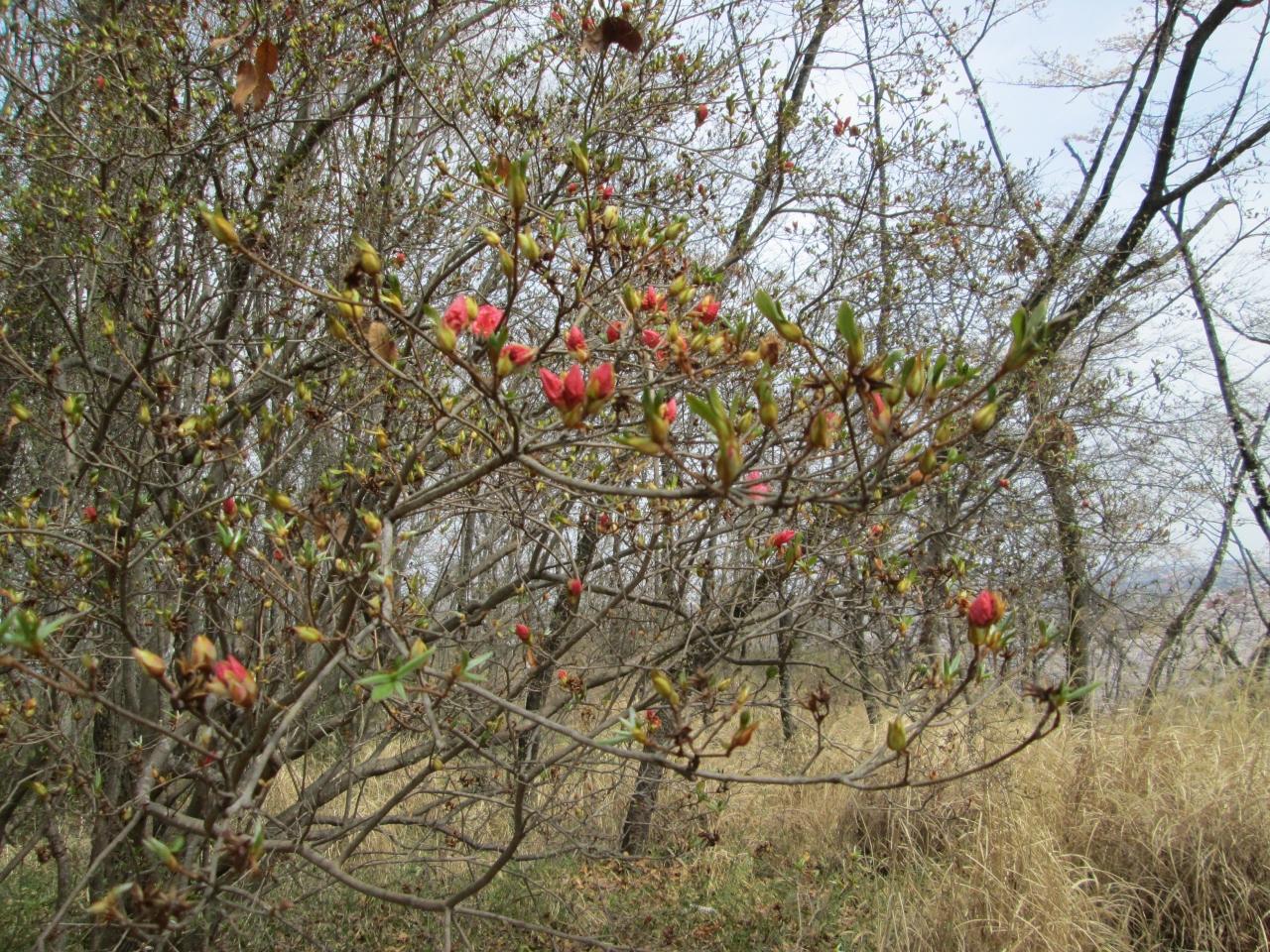 ヤマツツジ 半落葉低木でミツバツツジが終了するころに咲き始める。花の色は朱。丘陵地帯でも見られる