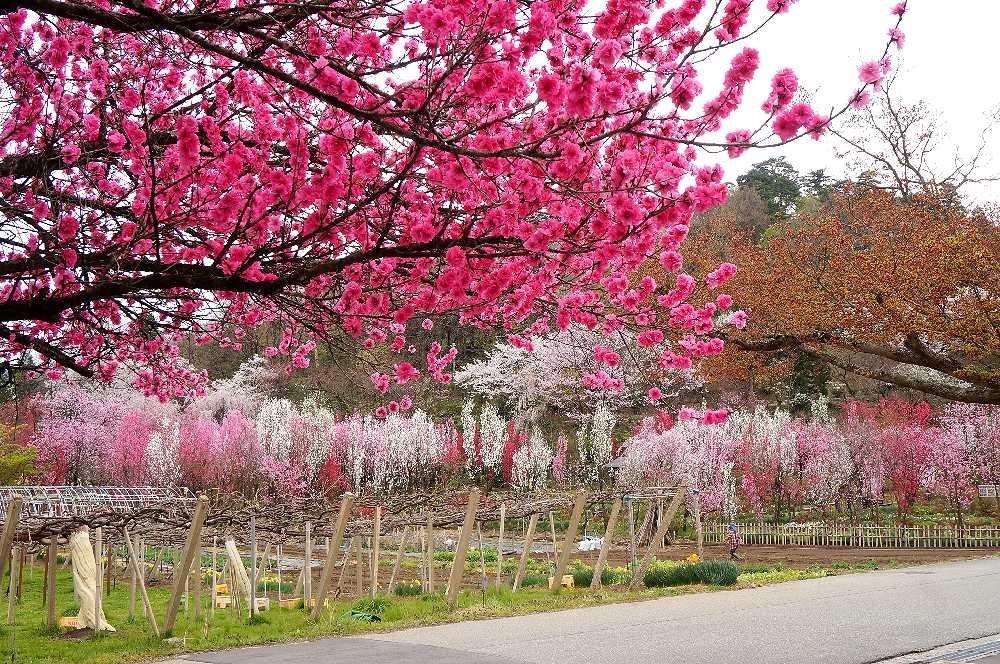 長引野の次は、近くの天神山ガーデンへ。地元魚津出身の植物研究家によって造成された植物園。現在は60名のボランティアによって運営・管理が行われ、富山県を代表する植物園となり、多くの人が訪れる。園内は、桜だけでなく、花モモ、シャクナゲ、水仙など様々な花々が植えられていて、桃源郷を思わせる美しい庭園となっている。入園料は徴収せず、協力金という名目で入口に箱がおいてあるだけ。一人300円が目安。