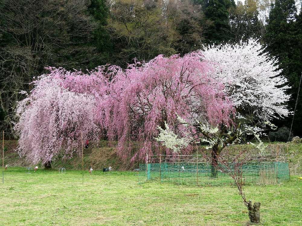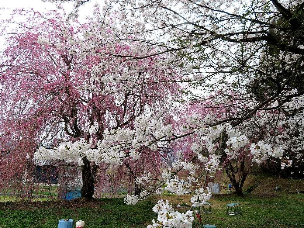 色違いのピンク色のしだれ桜と、その背後に真っ白な桜が咲いていた。