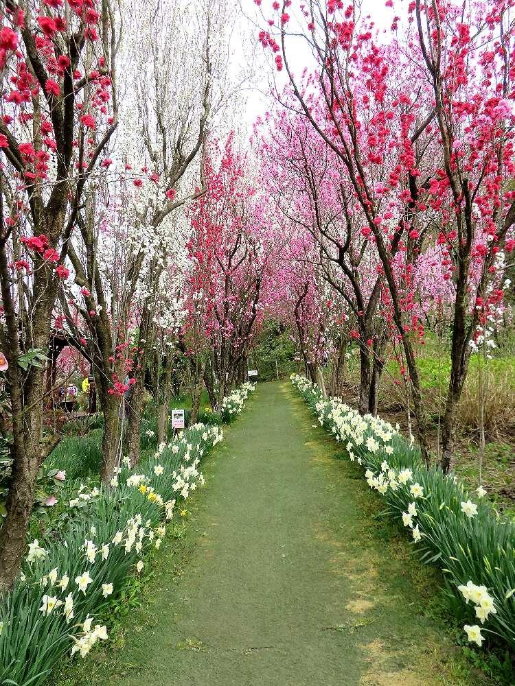 道端には白い水仙、道の両側は白や赤やピンクのモモの花。